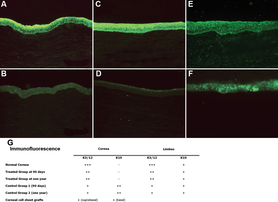 Figure 5. Immunofluorescence at 1 year. A normal corneal epithelium presents K3/12 (A) expression but no expression of K19 (B). Corneas of treated eyes also express K3/12 (C) but not K19 (D). In corneas of control 2 K3 is slightly expressed (E) and K19 is expressed in a patchy and erratic pattern (F). Table G discloses immunofluorescence results for central and peripheral corneas of normal, treated, and control eyes. Treated eyes