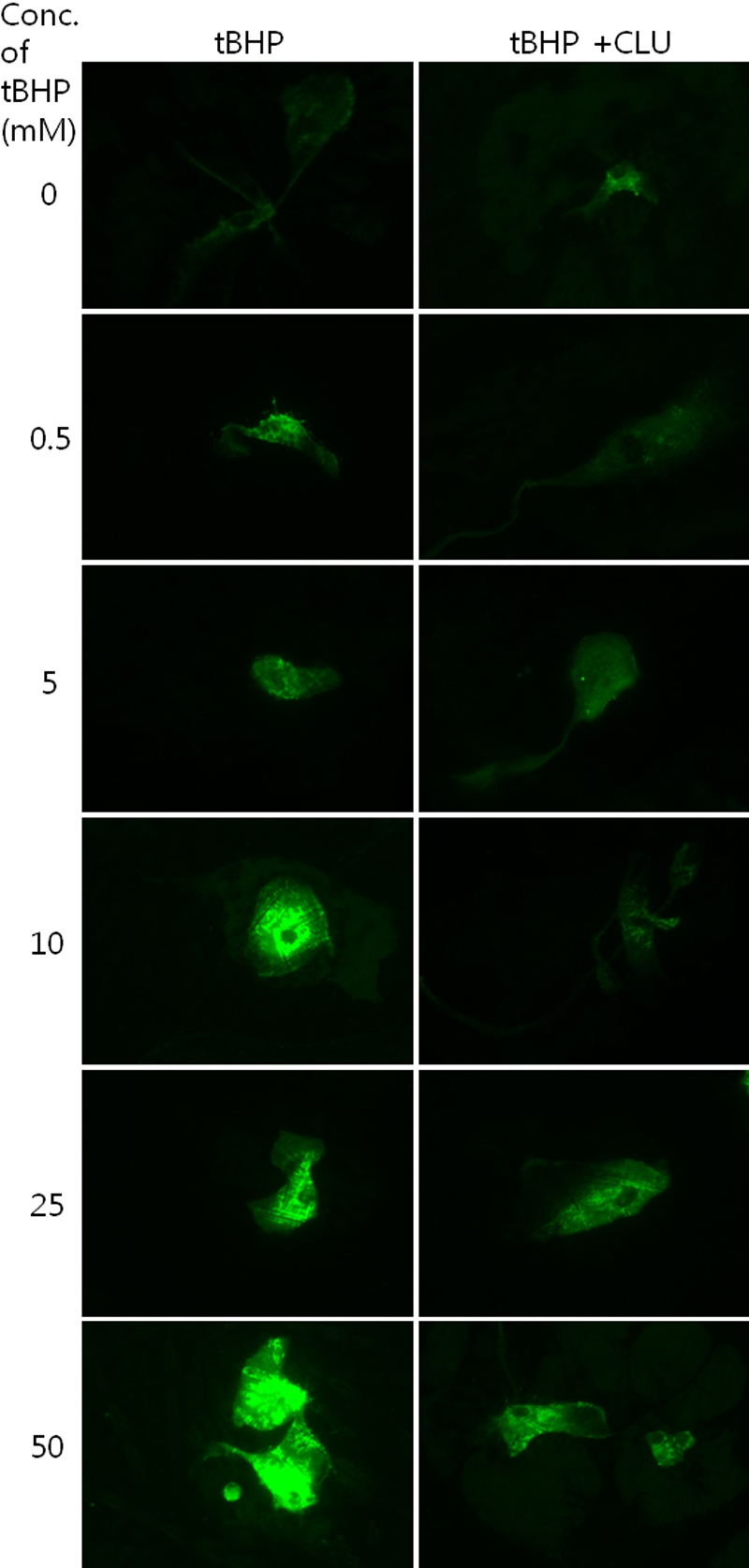 higher intensity of fluorescence at higher concentrations of tert-Butyl hydroperoxide (tBHP). The clusterin-treated group