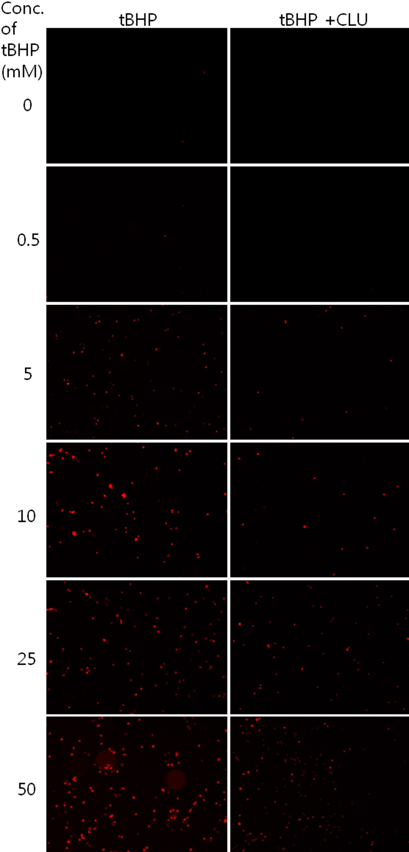 Detection of cell death using propidium iodide staining. The number of propidium iodide (PI)-stained cells increased with higher concentrations of tBHP and decreased in clusterin-treated groups, compared with the control.
