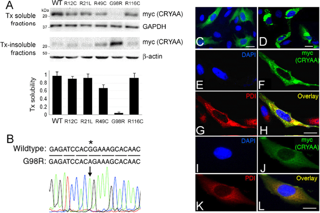 solubility of G98R CRYAA when compared to WT or other mutants. B: Direct sequencing of pHis/myc-CRYAAG98R to indicate the base change at c.292G>A. C–L: Confocal double immunofluorescence of WT and G98R CRYAA in B3 cells. C and D: A lower magnification to show the expression of WT (C) and G98R CRYAA (D) in cells. E–H: G98R CRYAA (myc staining in F) formed intracellular aggregates and was intensely co-distributed with PDI (G) in the overlay image (H). I–L: WT CRYAA (J, myc staining) was diffusely distributed in cytoplasm and had only mild co-distribution with PDI (K) in overlay image (L). Nuclei were stained with DAPI (blue, E and I). Scale bars: 10 μm (C–L). PDI: protein disulphide isomerase; DAPI: 4'-6-diamidino-2-phenylindole.