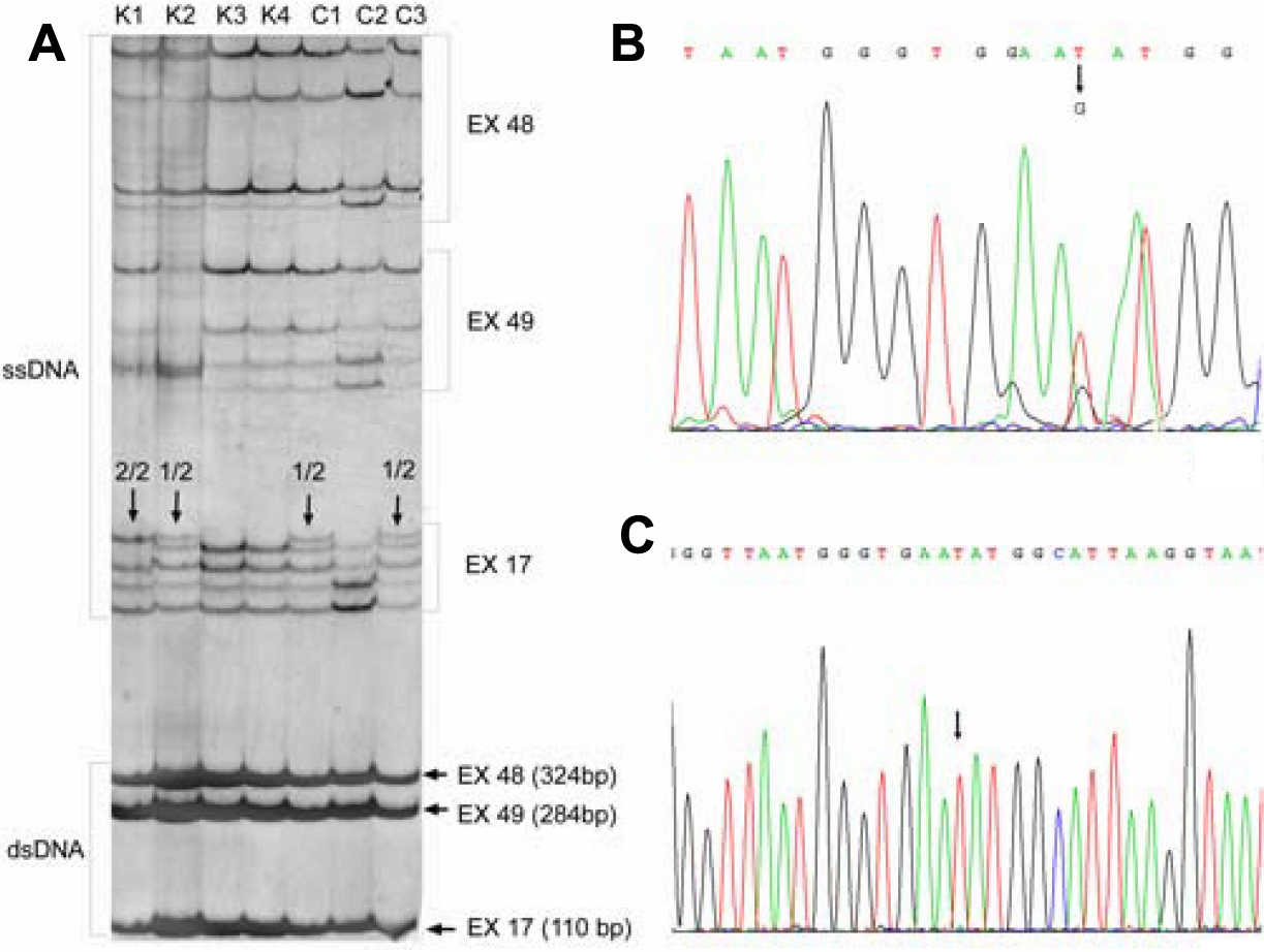 Exons 48 and 49 did not show any differences in elution shifts; in exon 17, the different patterns were subsequently sequenced.