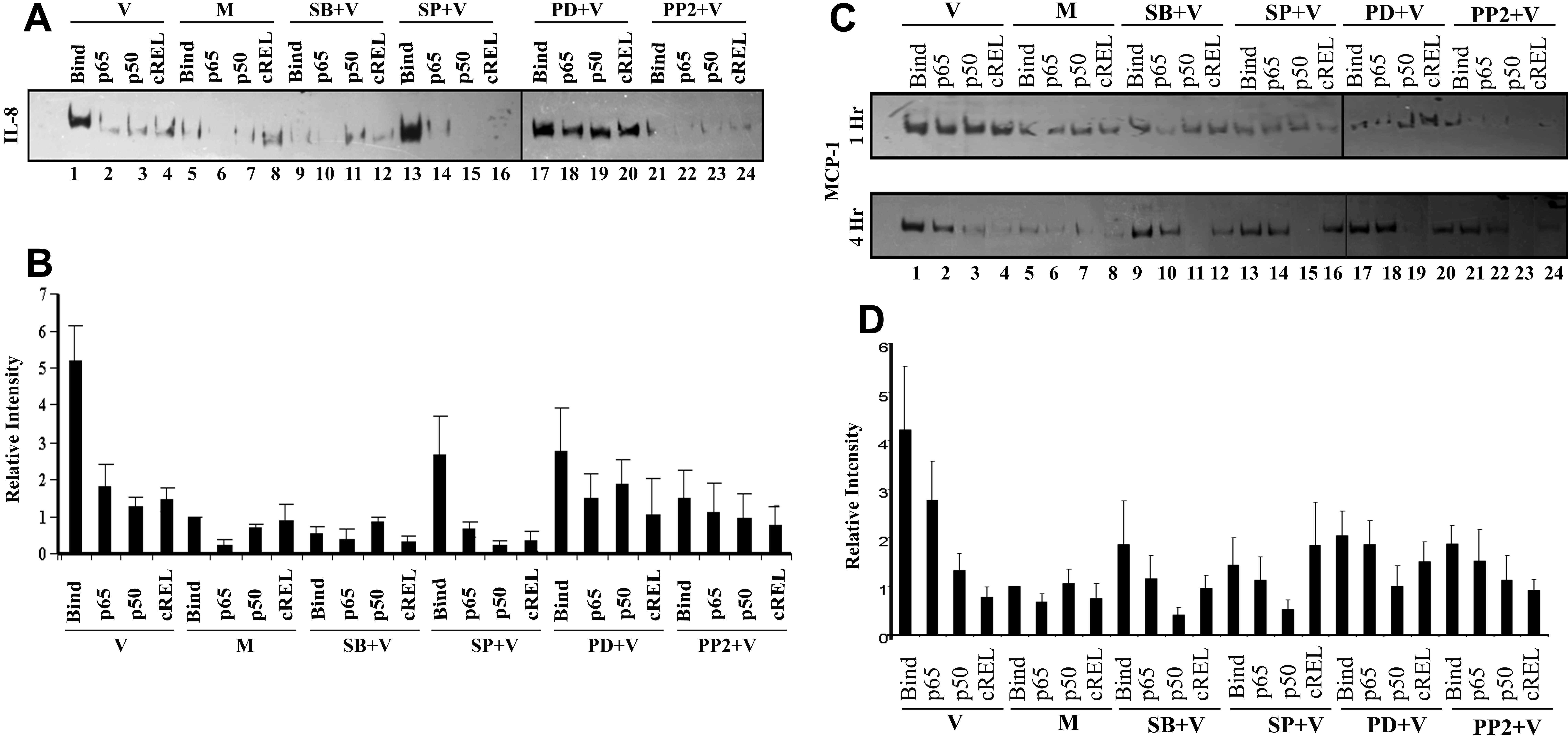 of NFκB subunits is reduced by specific inhibitors. A: EMSA was