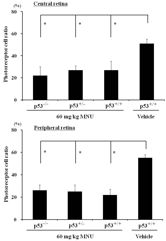 (MNU) to p53−/−, p53+/−, and p53+/+ mice. Photoreceptor cell ratio was calculated as [(outer retinal thickness)/(total retinal thickness)]×100. In mice treated