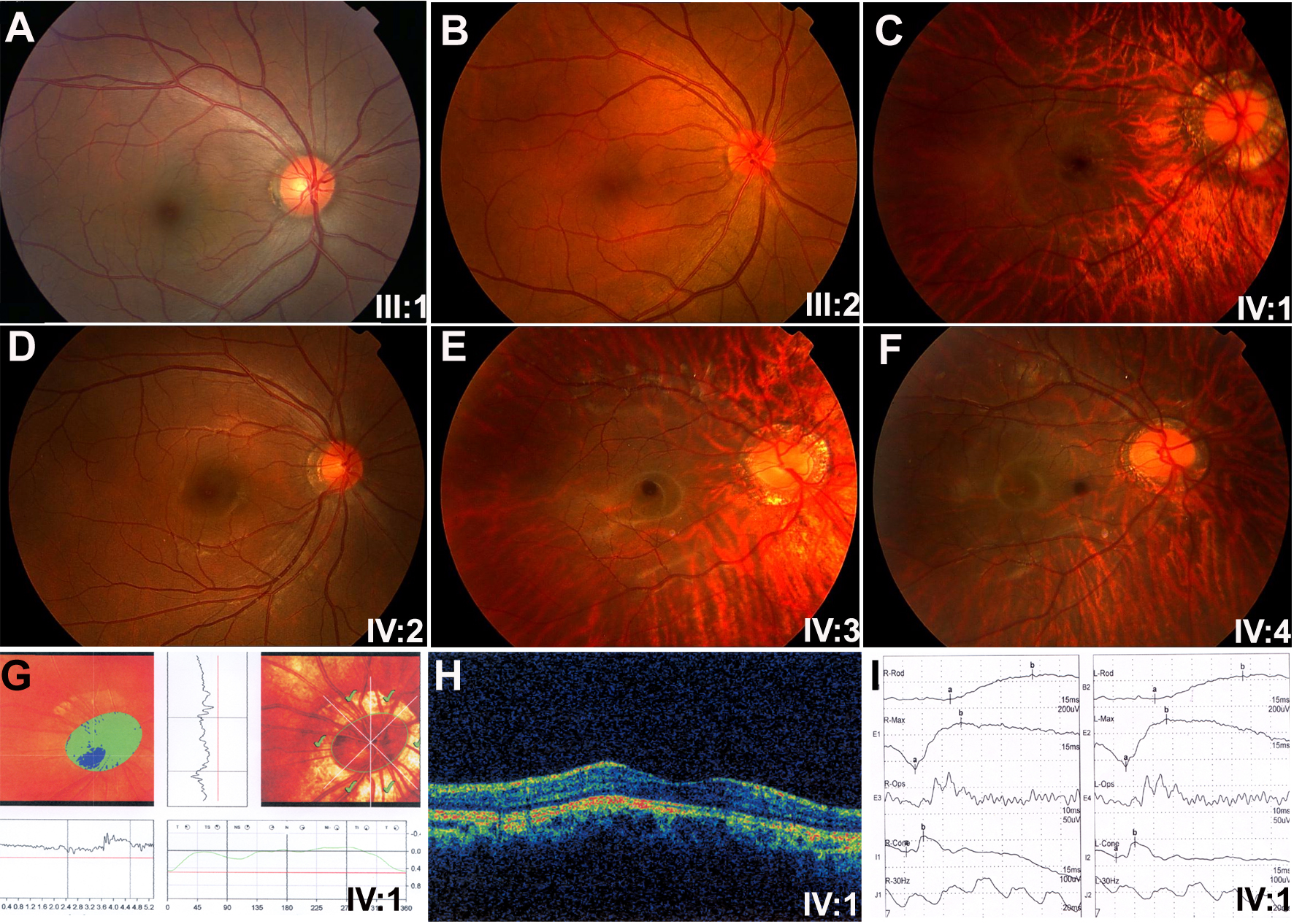 affected individual IV:1 are shown. Normal HRT and OCT and mild reduced