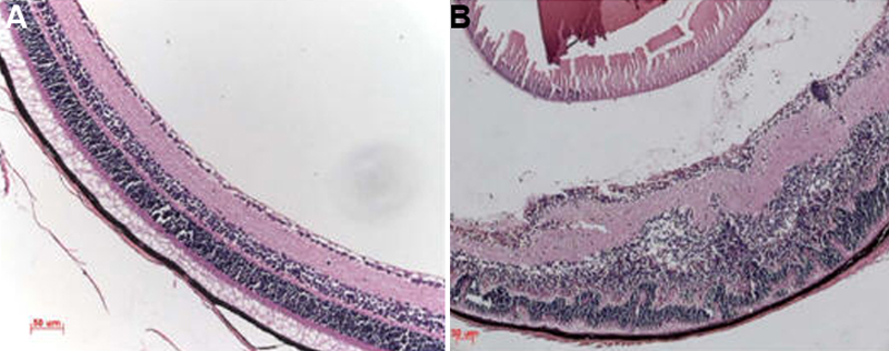 plane and stained with hematoxylin and eosin. A: Eye of CFA controls. The retina layers are well ordered and preserved. B: Eye of EAU mice. The normal structure of the retina is disorganized. Inflammatory cells infiltrate the ciliary body, choroid,