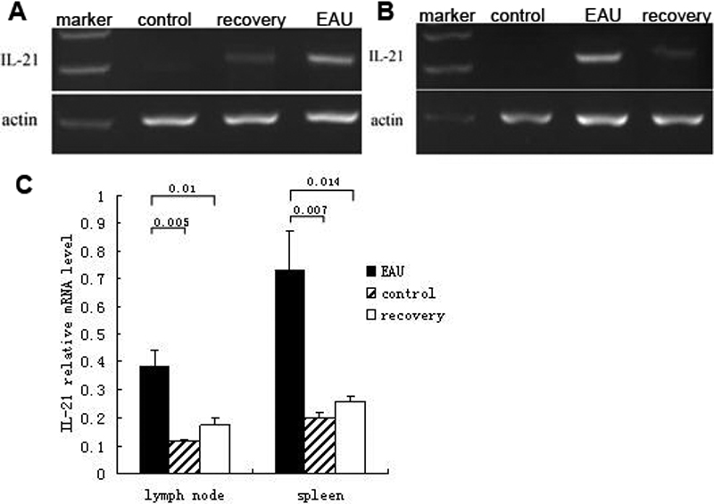 phase mice, and control mice were extracted and measured through RT–PCR. A: IL-21 mRNA of DLN cells in EAU, recovery phase mice, and control mice. B: IL-21 mRNA of spleen cells in EAU, recovery phase mice, and control mice. C: The relative IL-21 mRNA levels were determined as the ratio of the IL-21 PCR product over the β-actin product. Data are presented as mean±standard deviation; n=6 per group.
