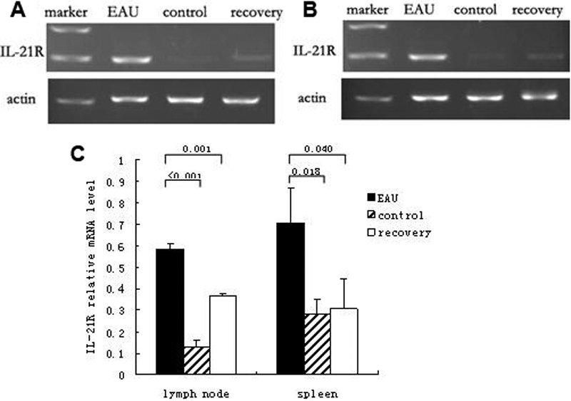 through RT–PCR. A: IL-21R mRNA of DLN cells in EAU, recovery phase mice, and control mice. B: IL-21R mRNA of spleen cells in EAU, recovery phase mice, and control mice. C: The relative IL-21 mRNA levels were determined as the ratio of the IL-21 PCR product over the β-actin product. Data are presented as mean±standard deviation; n=6 per group.