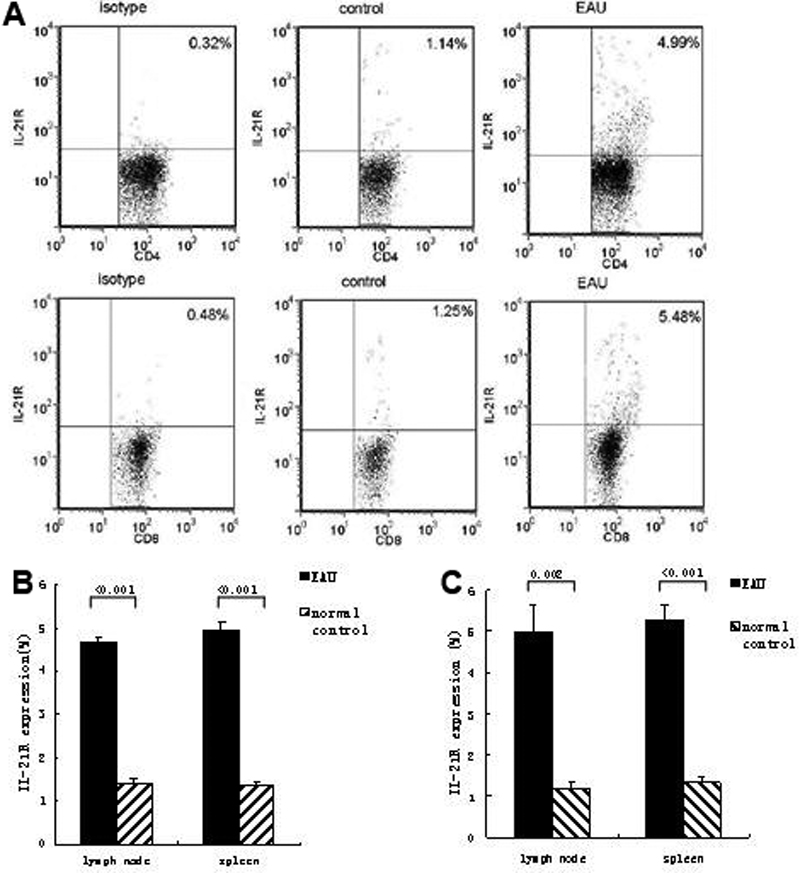 markers. A: Dot plots of IL-21R+ cells in CD4+ and CD8+ cells of EAU and control mice. Data shown are representative of six independent experiments. B: Percentages of IL-21R+ cells in CD4+ T cells of EAU and control mice. C: Percentages of IL-21R+ cells in CD8+ T cells. Data are presented as mean±standard deviation; n=6 per group.