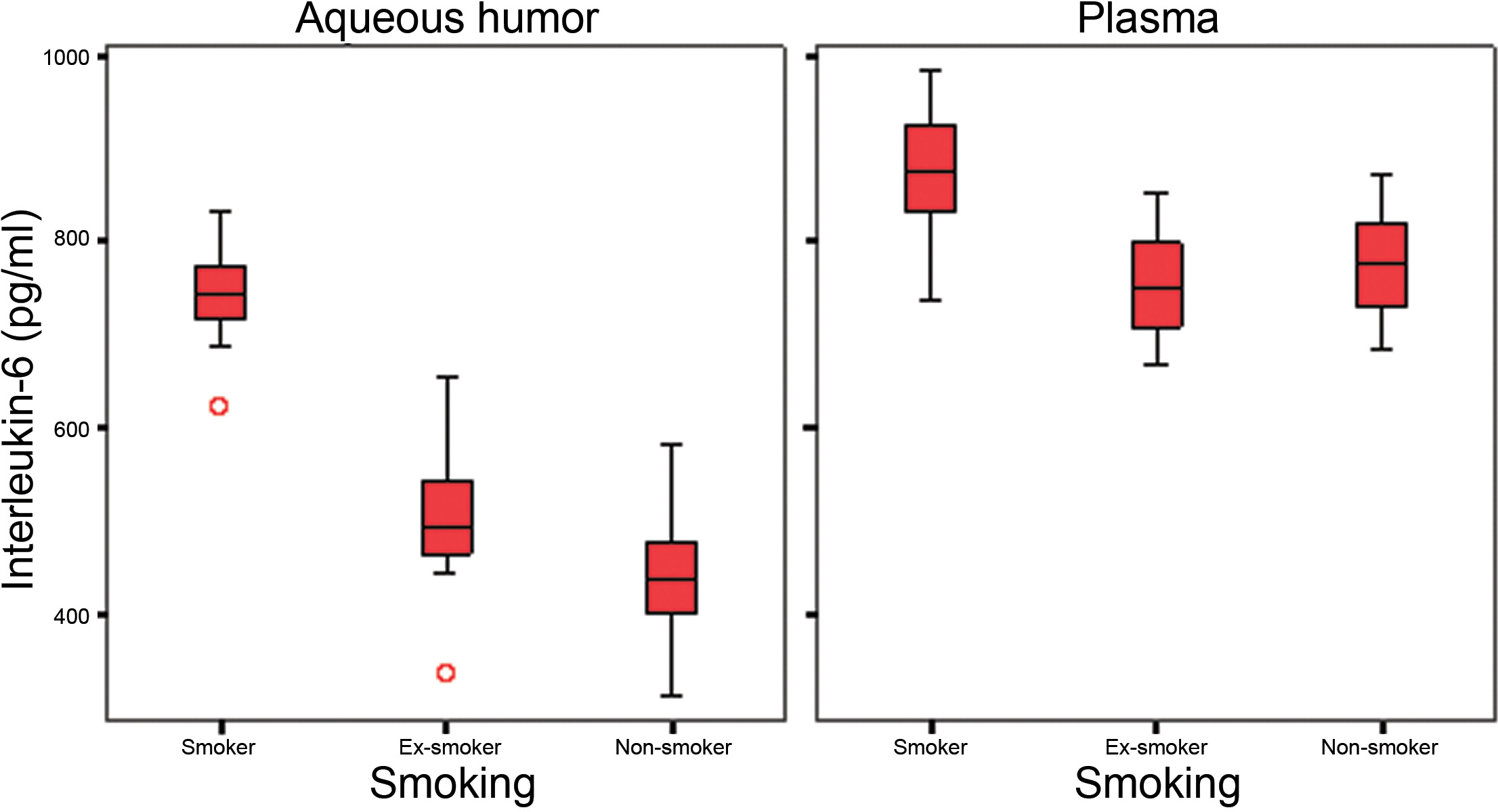Levels of interleukin-6 in aqueous humor and plasma of the study groups.