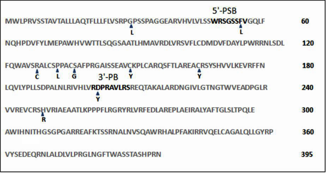 mutations are marked by amino acid position using letters with blue arrowheads. Bold letters show the location of the 5′phosphosulfate
