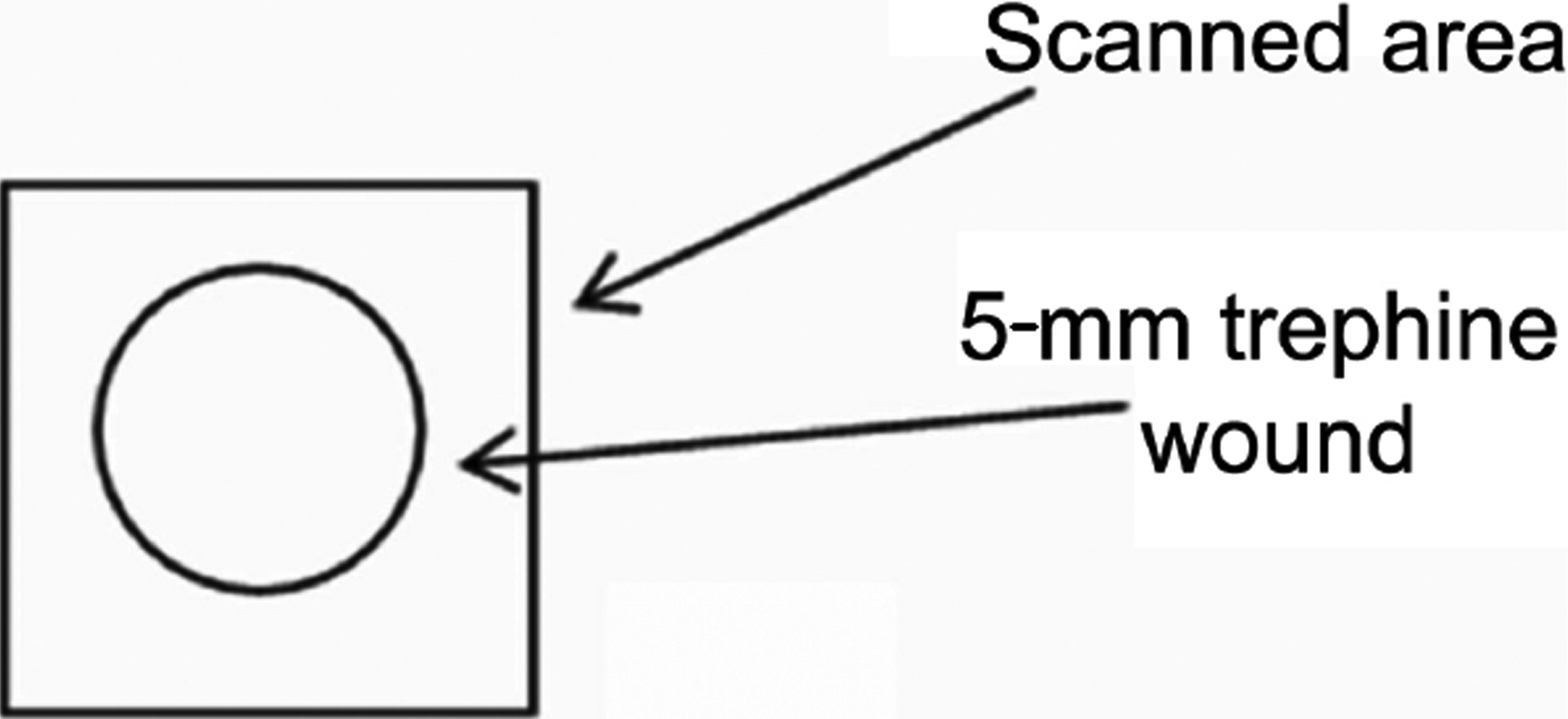 Square corneal piece from central cornea with the 5 mm trephine wound in the middle. The whole area of the corneal piece was scanned.