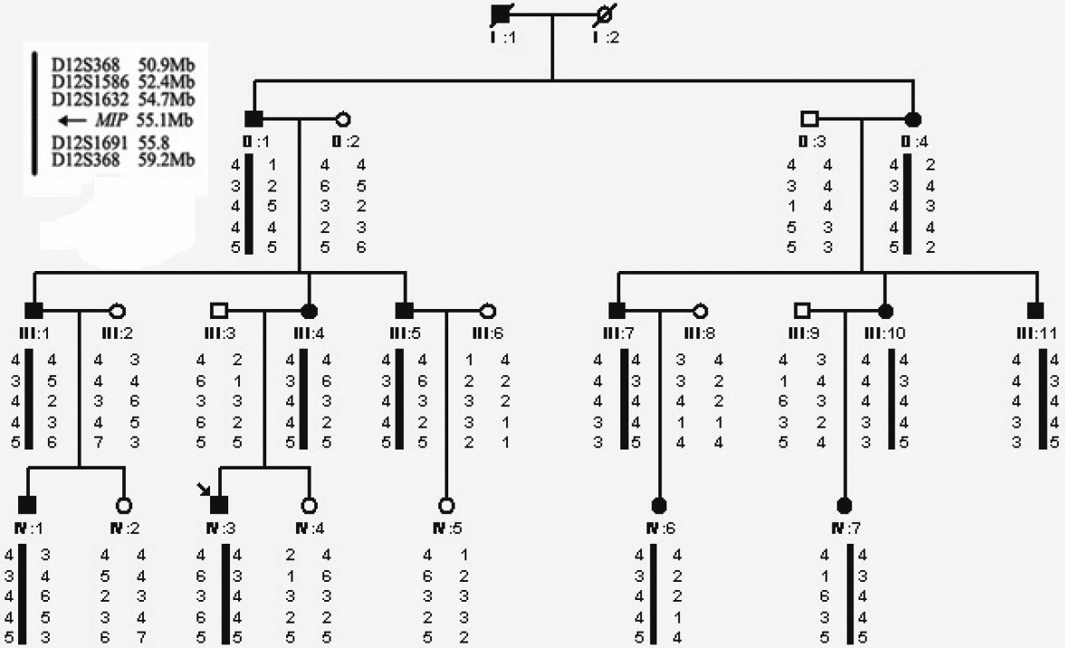 Figure 1. Pedigree of the Chinese cataract family and haplotype analysis. Squares and circles indicate males and females, respectively.