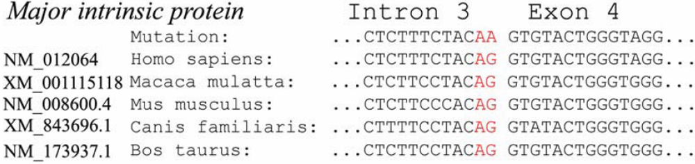 Multiple-sequence alignment of acceptor splice site in intron 3 of