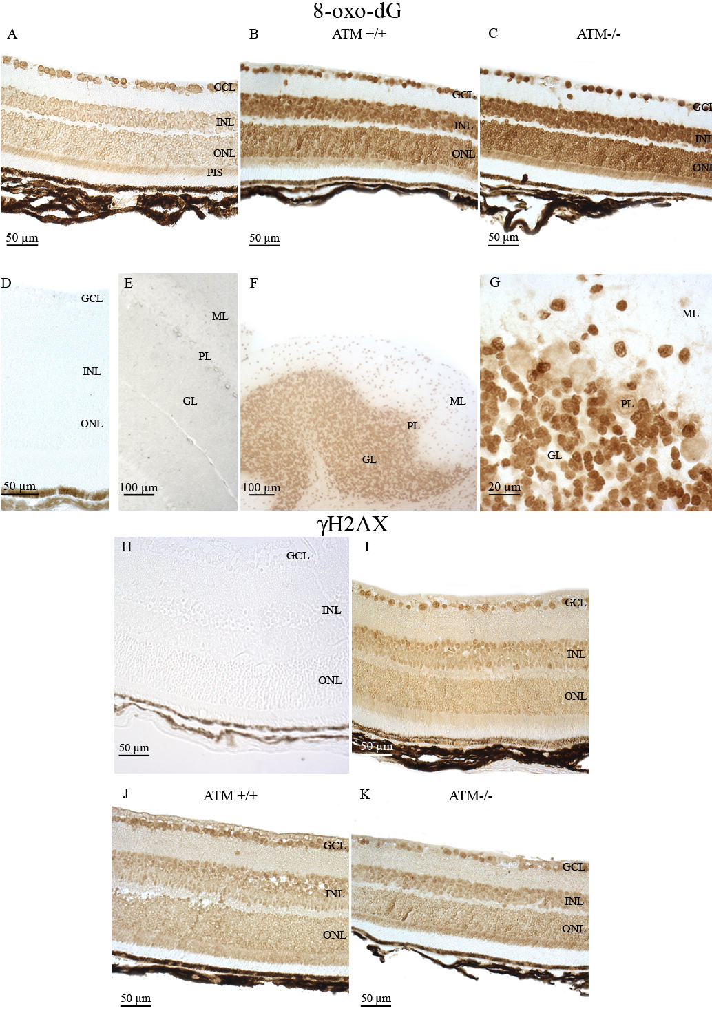 retinal cells of C57BL/6J (A), Atm+/+ (B), and Atm−/− mice (C). No specific retinal (D) or cerebellar (E) signal could be detected in control experiments. The 8-oxo-dG immunostaining was also observed in cerebellar cells (F). A high magnification of 8-oxo-dG immunostaining in the Purkinje cell layer (PL; G) is shown. Specific mouse γH2AX immunostaining was detected in adult mouse ocular tissue sections. No specific immunoreactivity