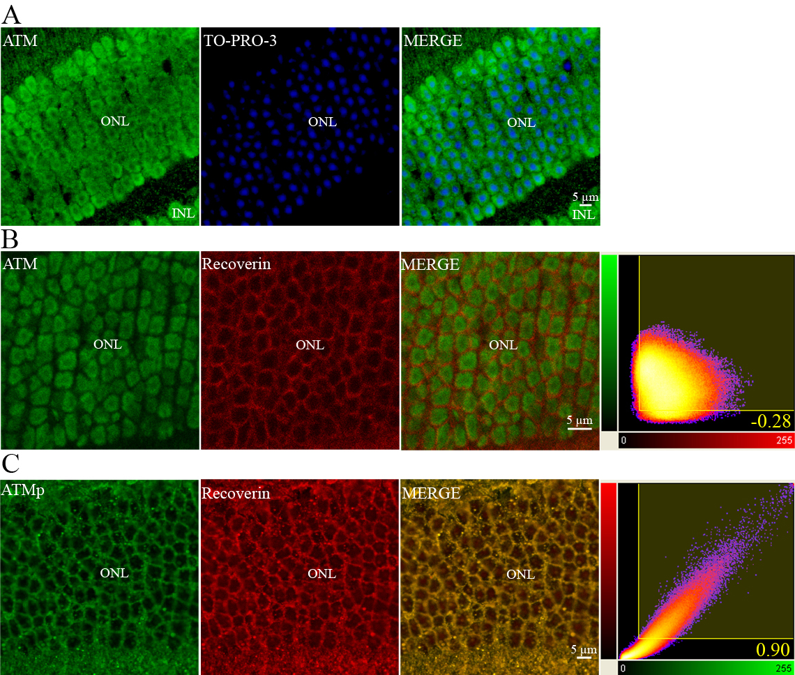 coefficient is 0.90. ATMp immunostaining colocalized extensively with recoverin immunostaining in photoreceptor cells (C). Abbreviations: Inner nuclear layer (INL), and outer nuclear layer (ONL).