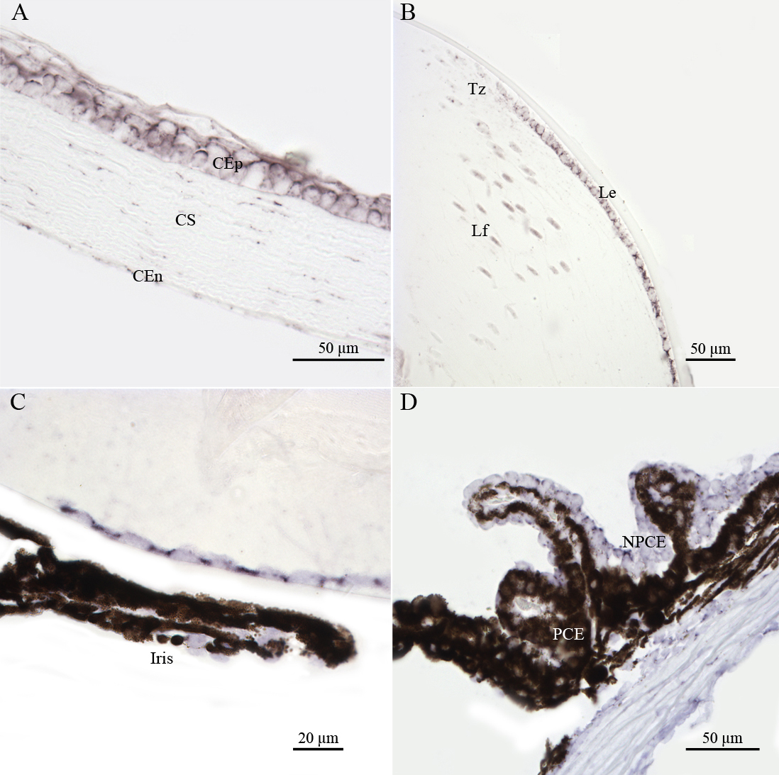 corneal endothelial (CEn) cells (A), in the lens epithélium (Le), transitional zone (Tz), and lens fibers (Lf; B), in iridal cells (C), and in pigmentary ciliary epithelium (PCE) and nonpigmentary ciliary epithelium (NPCE) cells (D). These results demonstrate that Atm gene is transcribed both in dividing and non dividing nonretinal cells of the adult
