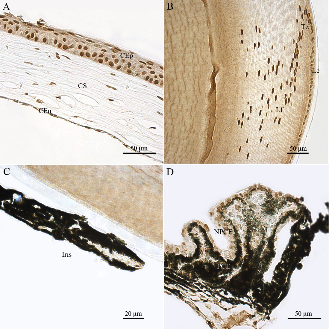 observed in corneal epithelial (CEp), corneal stromal (CS), and corneal endothelial (CEn) cells (A); in the lens epithelium (Le), transitional zone (Tz) and lens fiber (Lf; B); in iridal cells (C) and in the pigmentary ciliary epithelium (PCE) and nonpigmentary ciliary epithelium (NPCE) cells (D). ATM immunoreactivity is primarily detected in the nucleus of nonretinal ocular cells
