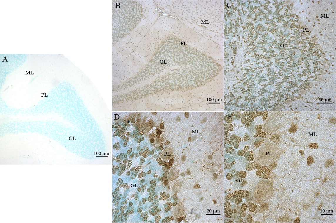 detected in control experiments, where the specific anti-ATM primary antibody was omitted (A). ATM immunolabeling was detected in specific neuronal layers of the adult mouse cerebellum (B). A high magnification of ATM immunostaining in the granular cell (GL), molecular cell (ML), and Purkinje cell (PL) layers