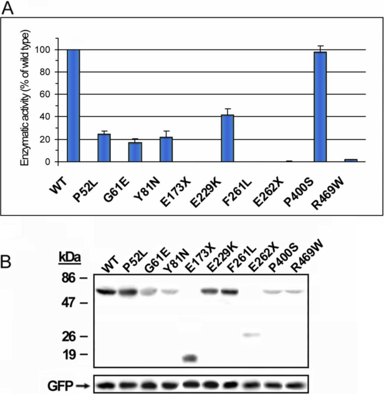 Figure 4. Effect of CYP1B1 mutations found in Spanish PCG patients on CYP1B1 catalytic activity. A: cDNA constructs encoding the different mutations were transiently expressed in HEK-293T cells. Transfection efficiency was