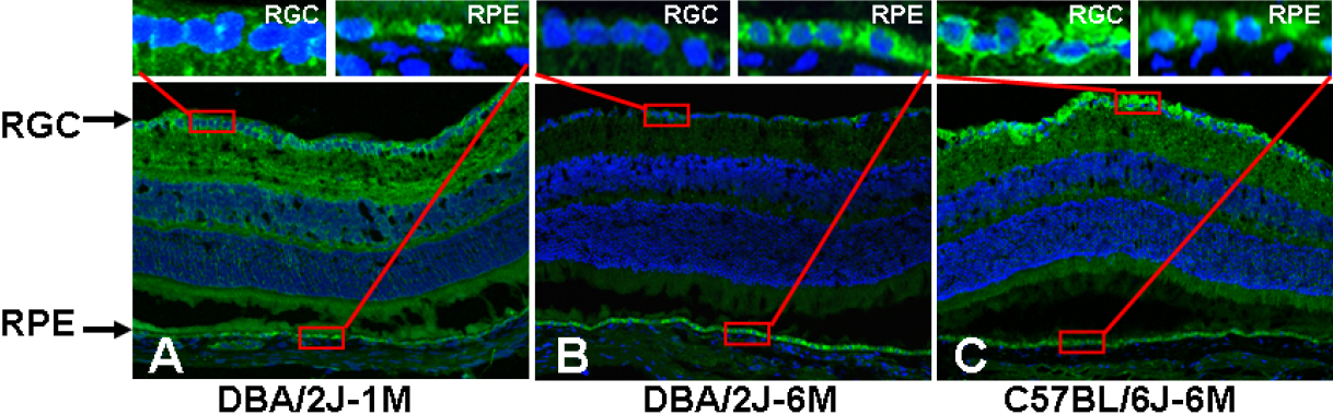 Figure 3. Immunofluorescent localization of PEDF in retina from DBA/2J and C57BL/6J mice. A: PEDF immunoreactivity localizes to the RGC and RPE layers in DBA/2J mice at 1 month old. B: Decreased PEDF expression in the RGC layer of DBA/2J mice at 6 months, with residual staining in the RPE. C: In C56BL/6J mice, PEDF is localized mainly in the RGC and RPE layers. Insets show higher magnification.