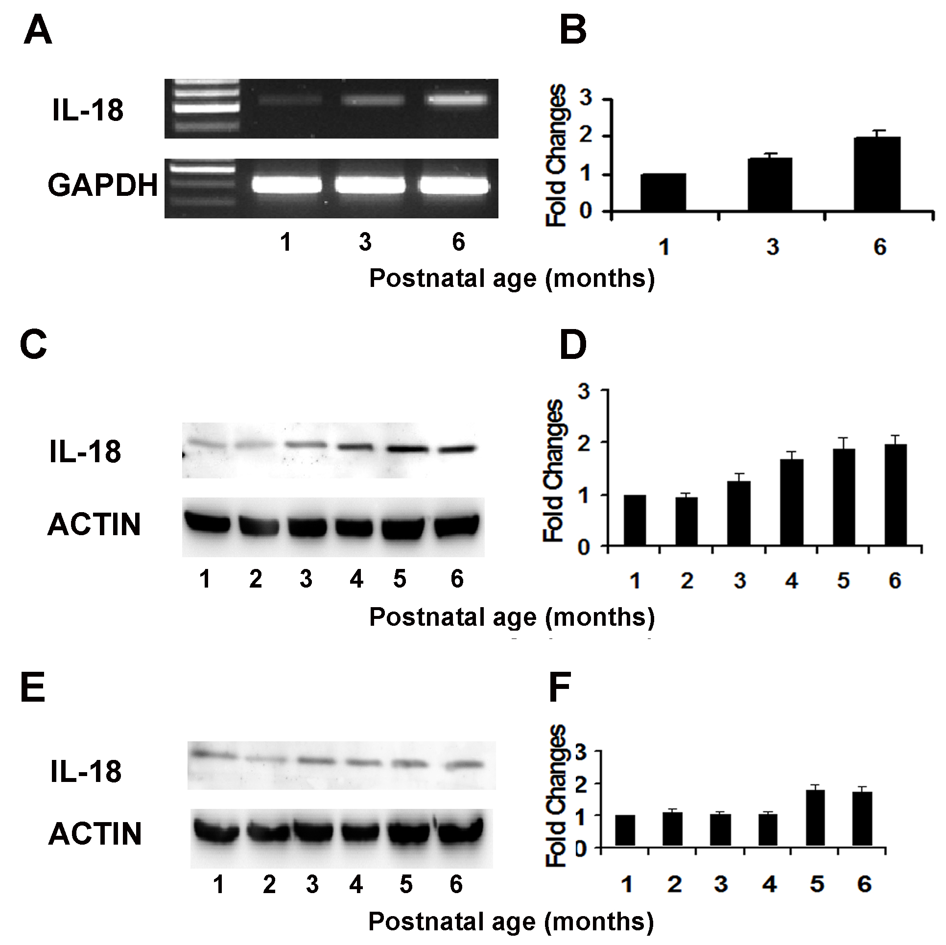 6 months when compared with 1 month of age. E: Western blot of IL-18 protein expression in optic nerve from DBA/2J mice at 1 to 6 months of age. F: Densitometric analysis of 3 independent experiments from E, shows increased IL-18 protein expression compared to actin loading control in optic nerve from DBA/2J mice by 5 months of