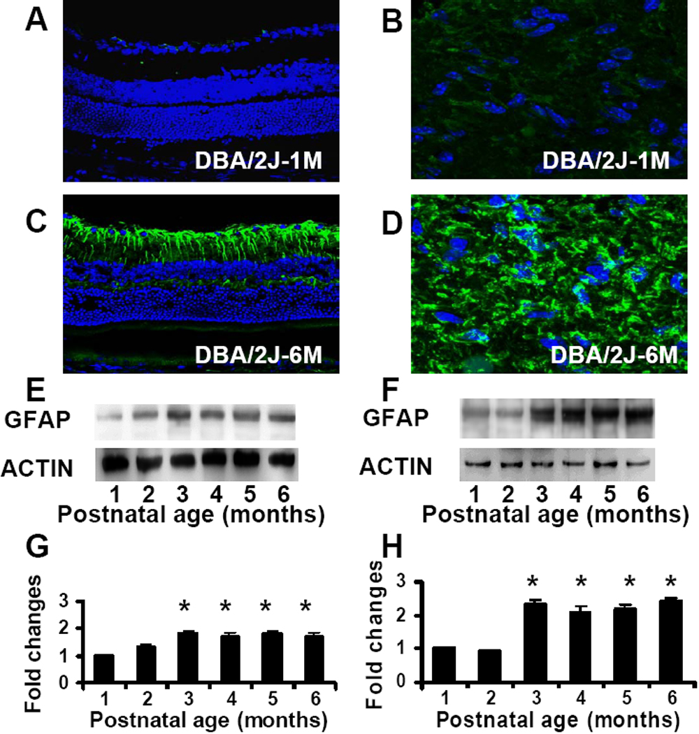 retinal Müller cells and optic nerve. E,F: western blot analysis for GFAP protein in the retina and optic nerve, respectively. G,H: Densitometric analysis of 3 independent experiments from E and F, using actin as a loading control. Statistical analyses for this experiment was performed using ANOVA with the Scheffé multiple