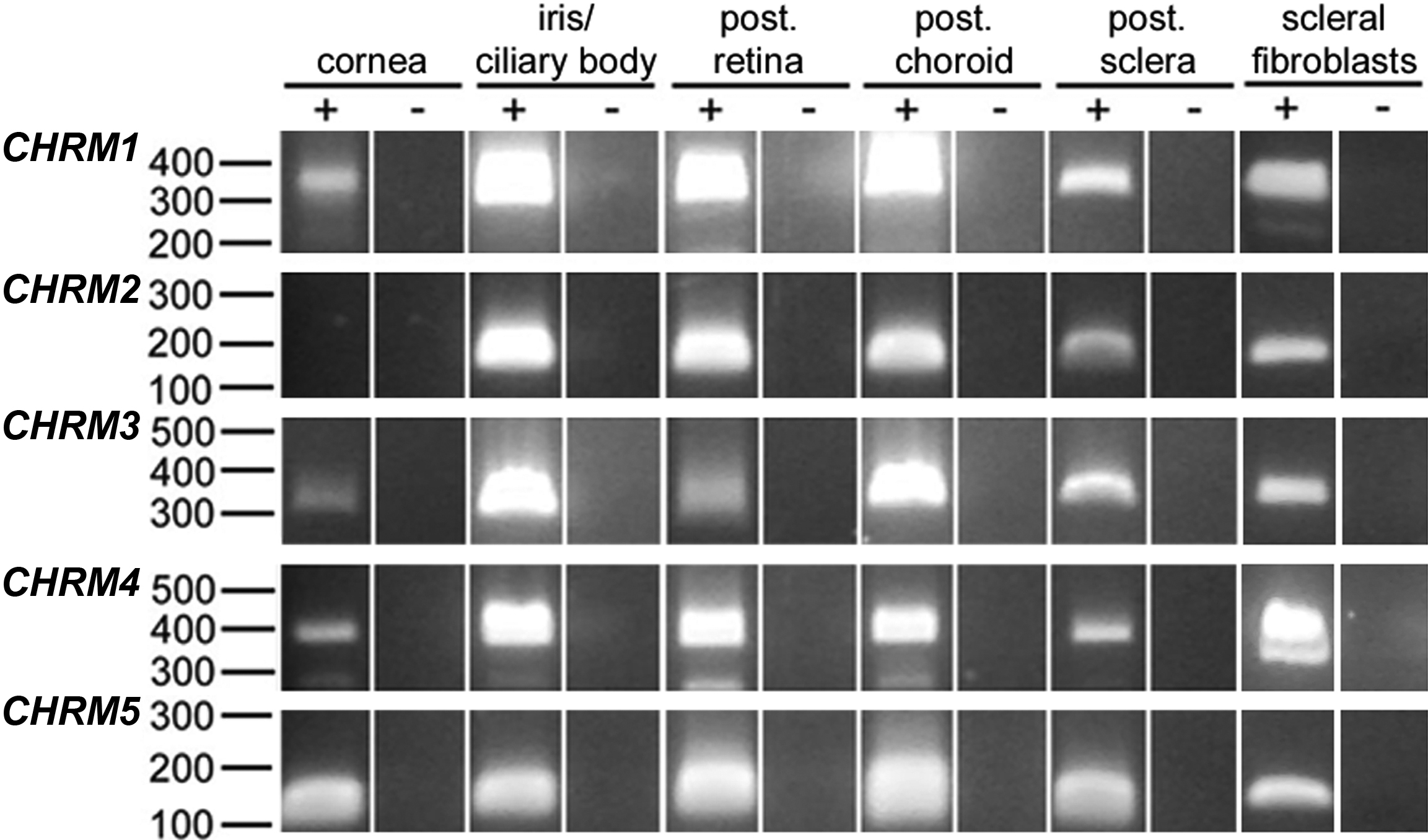 bp), CHRM2 (197 bp), CHRM3 (325 bp), CHRM4 (394