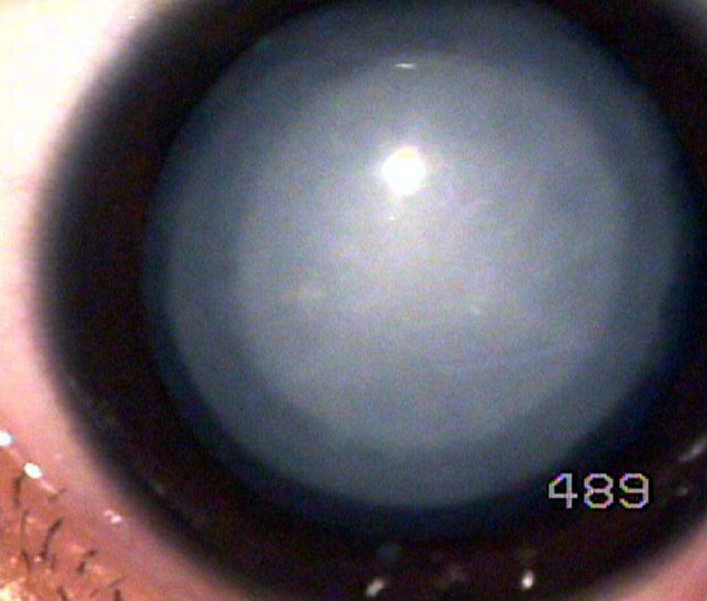 Figure 1). Cataract is of the opalescent type. The central nuclear region is more dense than the periphery.