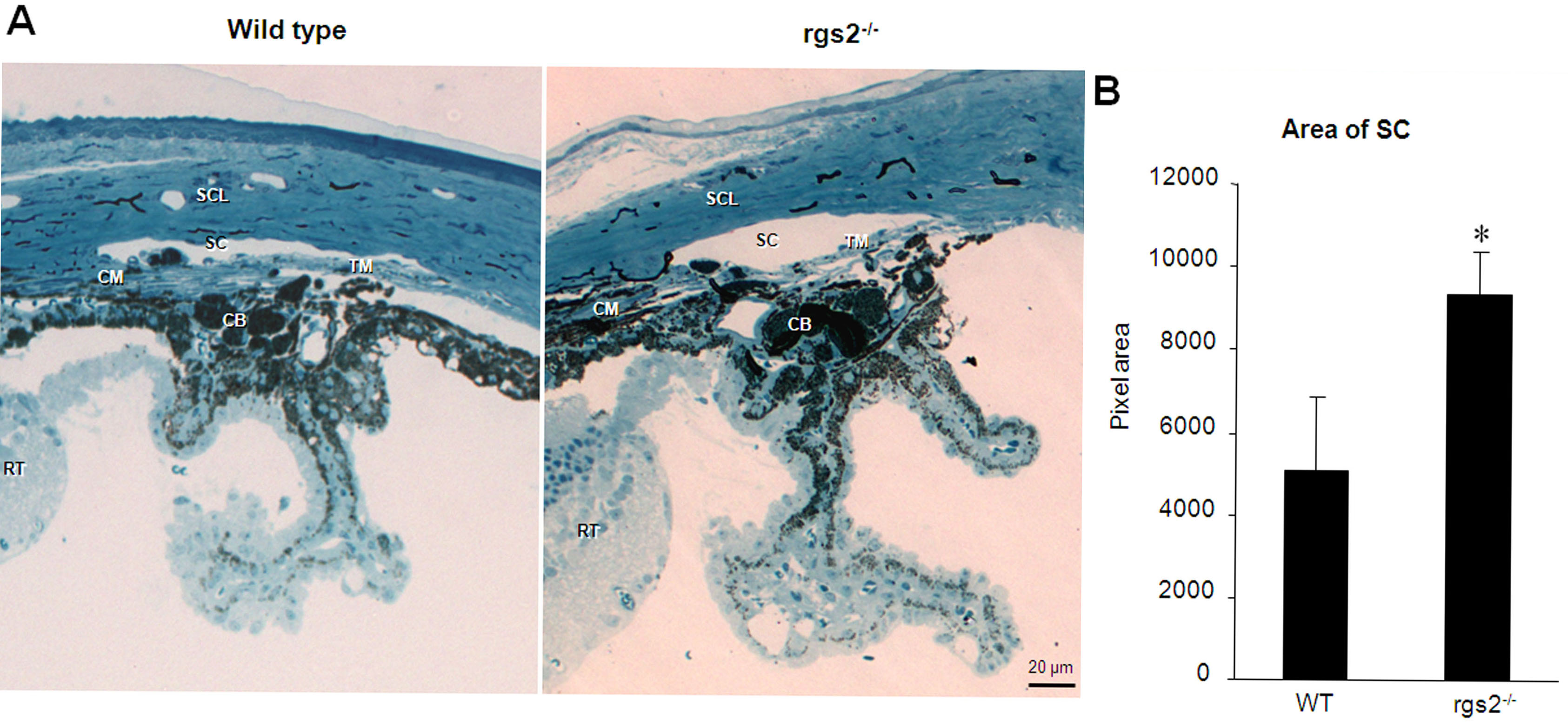 in the aqueous humor outflow pathway and ciliary body between the RGS2−/−