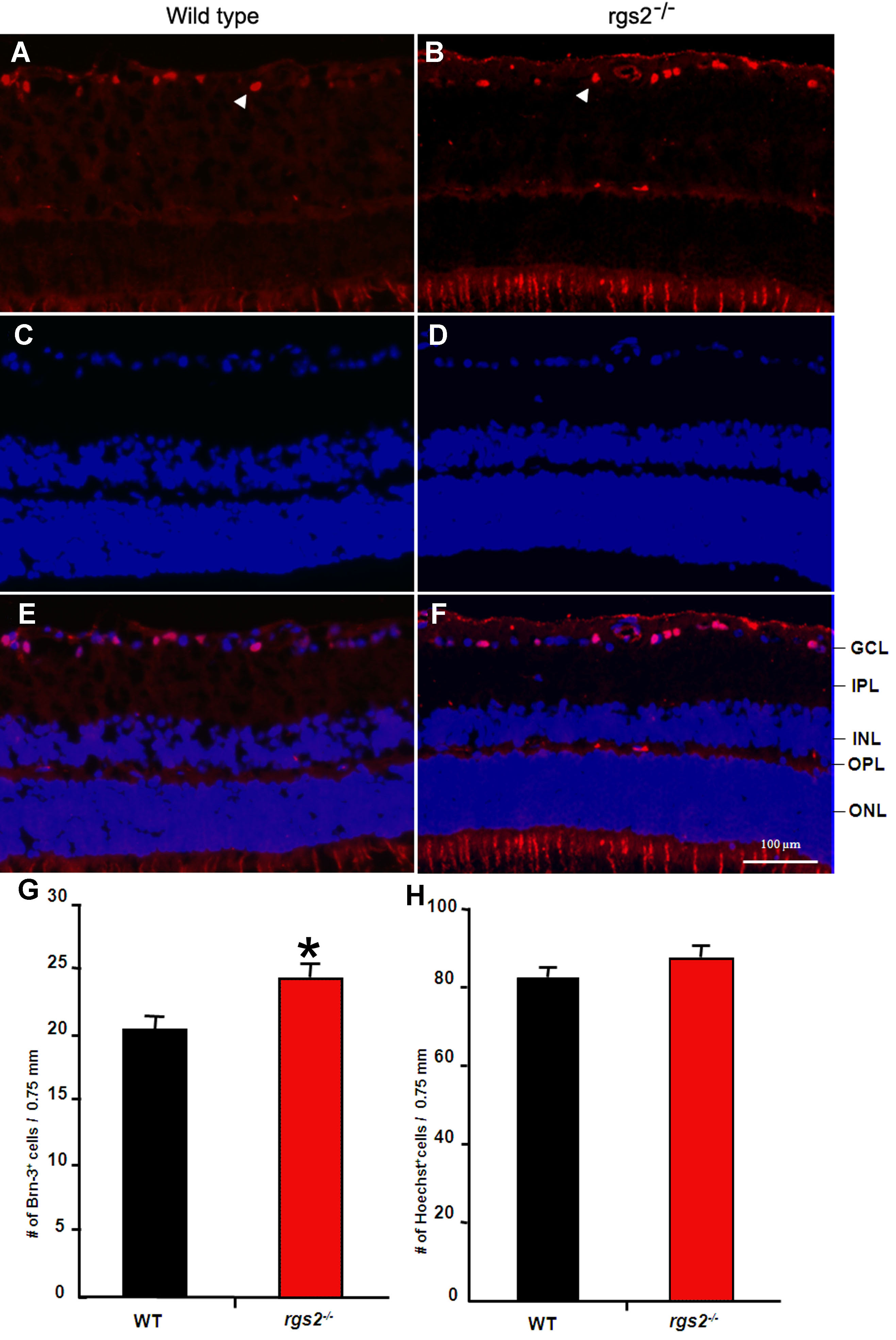 retinal ganglion cell survival in the RGS2−/− mice, we used retinal