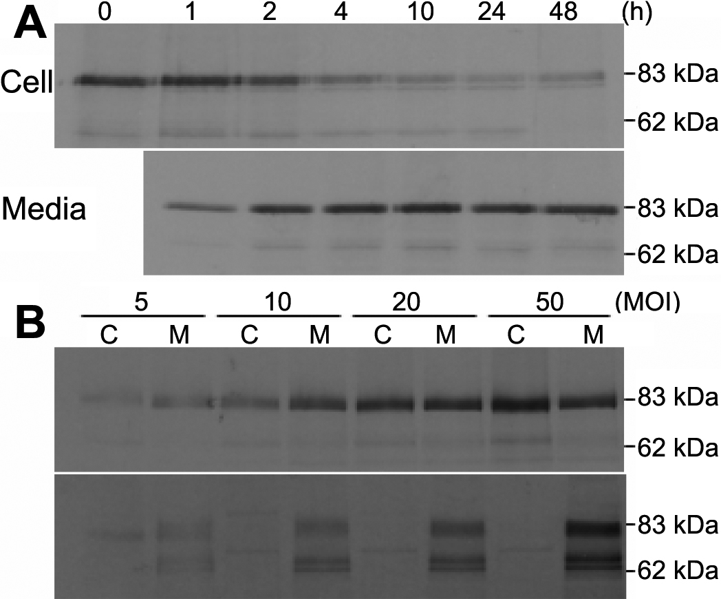 labeled and chased for 4 h. The cells (C) and culture media (M) were separately harvested and processed the same as in A. Each experiment was performed two times with identical results. The bands resolved at approximately 68 kDa might be degraded