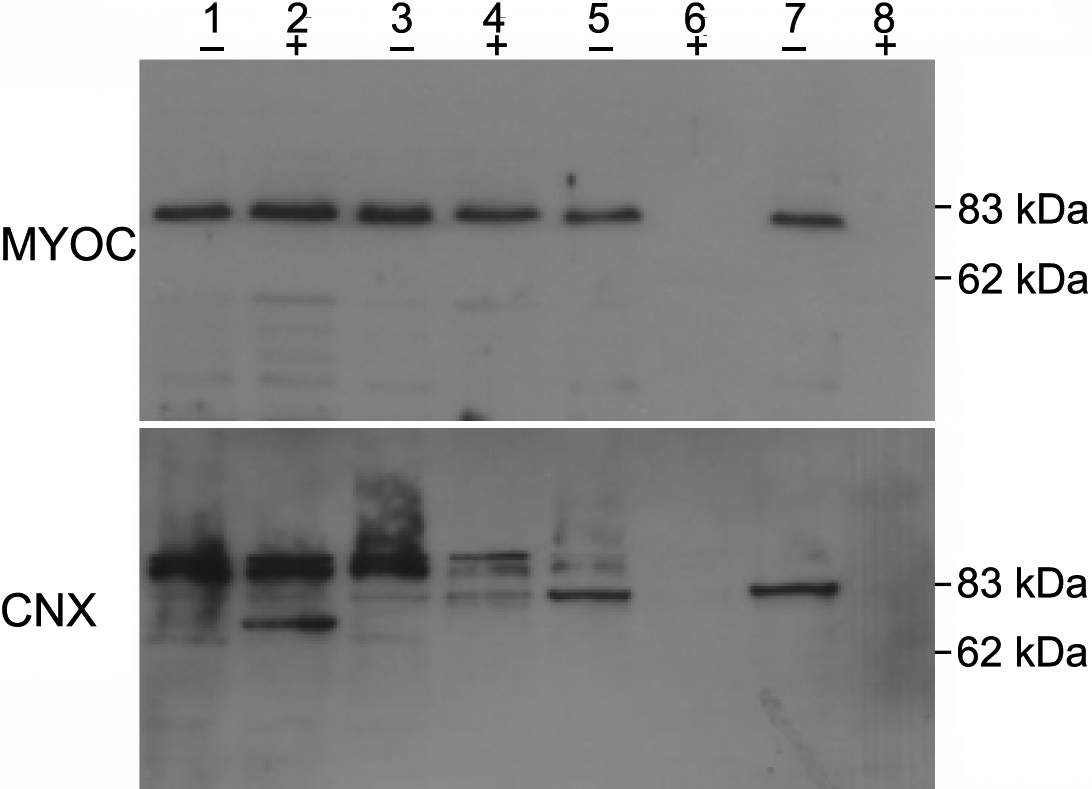 5 and 6; 100 μg lane 7 and 8). After digestion, the membrane was probed with anti-myocilin antibody (upper panel), stripped,