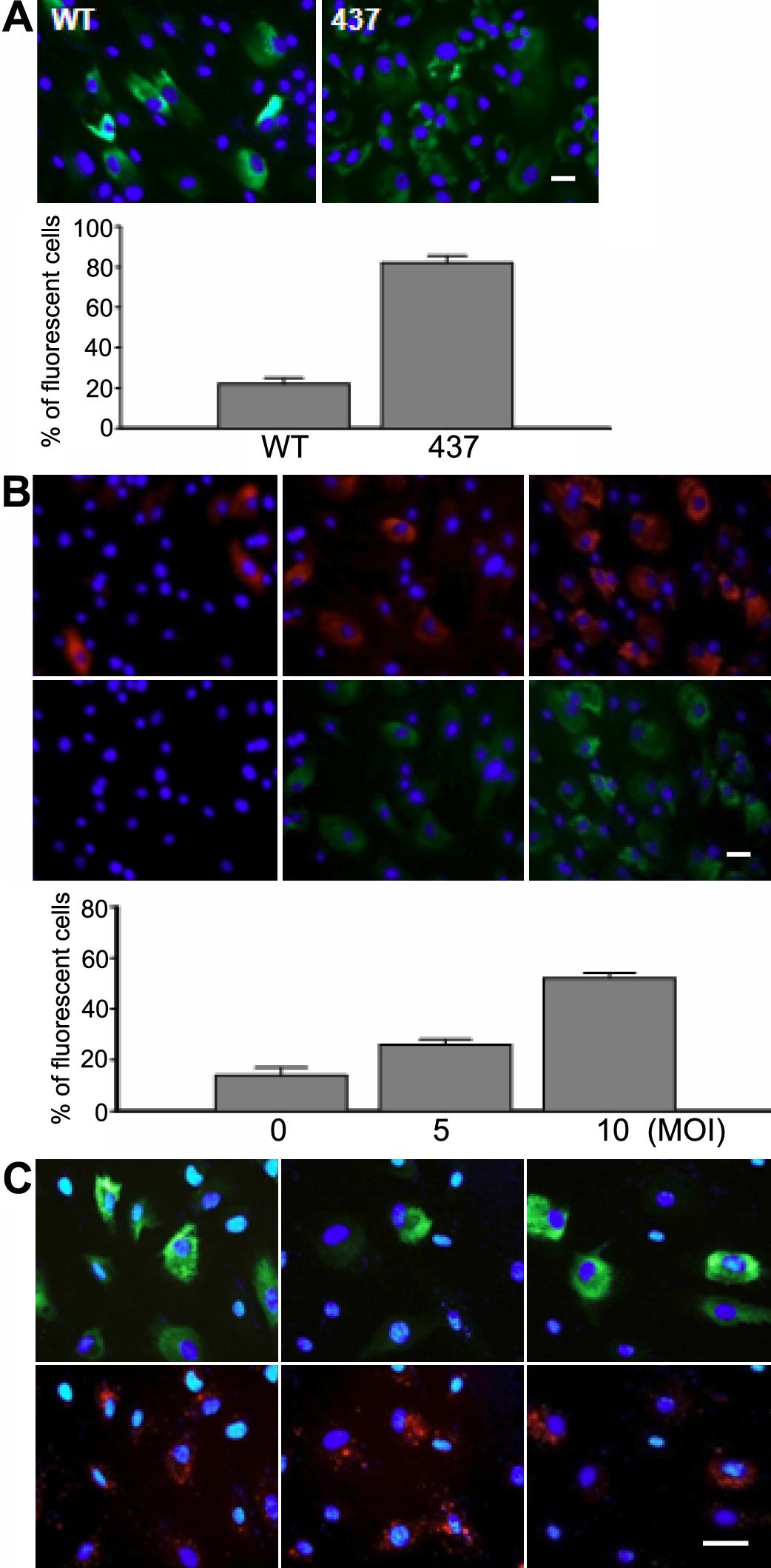 Figure 6. Fluorescence microscopic analysis of myocilin expression. A: HTM cells were transduced with Ad-myocilin-GFP (WT) or Ad-Y437H myocilin-GFP (437) at an MOI of 10 pfu and expressed for