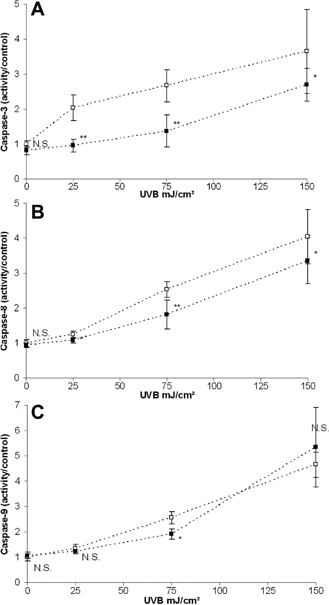 irradiated with various doses (0, 25, 75, and 150 mJ/cm2) of UVB. Caspase-3 (A), -8 (B), and -9 (C) activations were determined 24 h after irradiation. Data are mean±SD of three independent experiments. Differences were