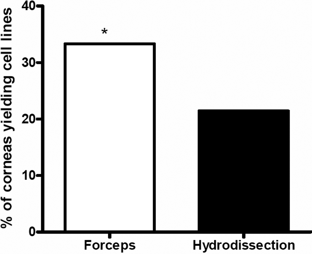 Comparison of success of harvesting methods. Forceps stripping yielded successful cell lines in 33.3%, and hydrodissection in 21.4% of all corneas used with these methods, respectively. The asterisk indicates p≤0.05 (χ