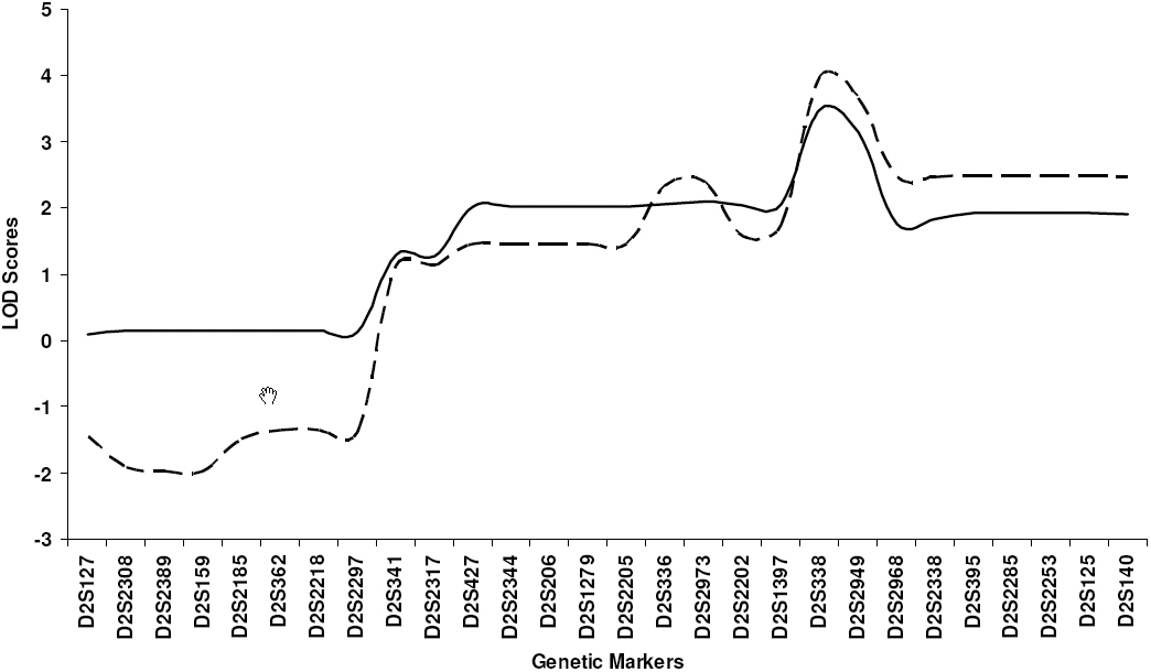 LOD Scores for the fine mapping linkage analysis on chromosome 2q37. Parametric (solid line) and nonparametric (dashed line) LOD scores are shown for the three GEM families (GEM0046, GEM0251, and GEM0206).