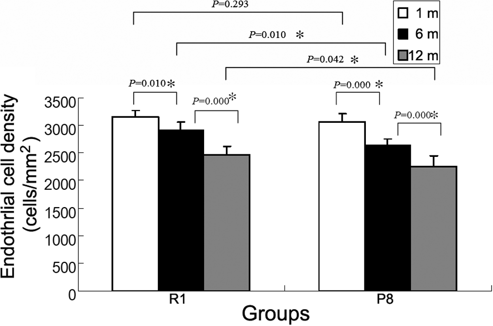 Figure 2. Changes in the endothelial cell density values at various ages for each experimental group. The results indicate a significant