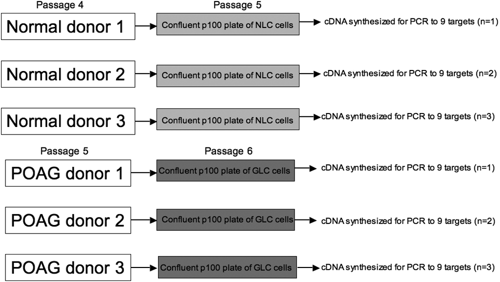 Figure 2. PCR validation assay experimental design. Total RNA (3 μg) was used from three normal and three POAG LC cell lines to synthesize