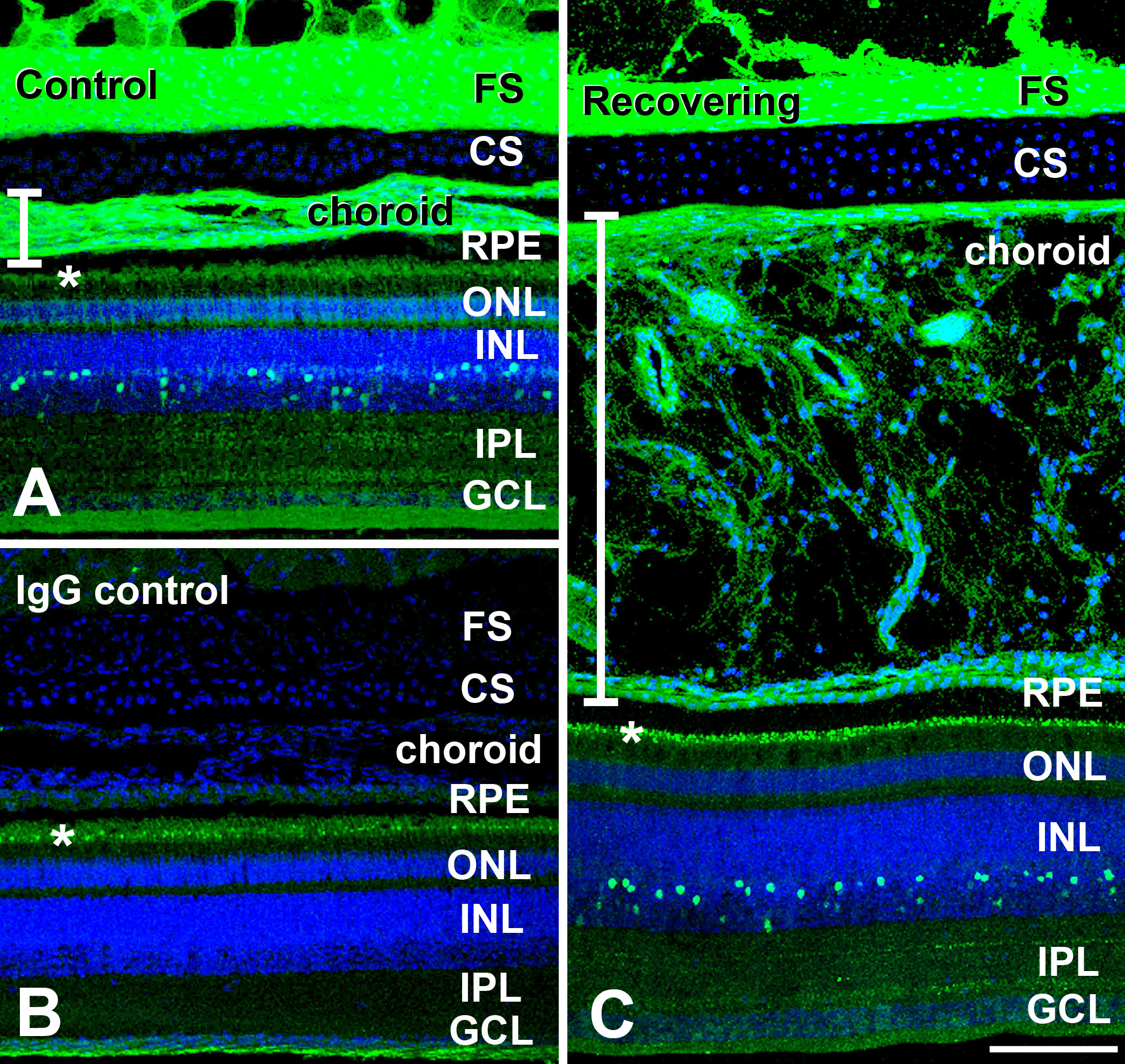 choroid layer in control (3A) and recovering (3C) eyes. Abbreviations: