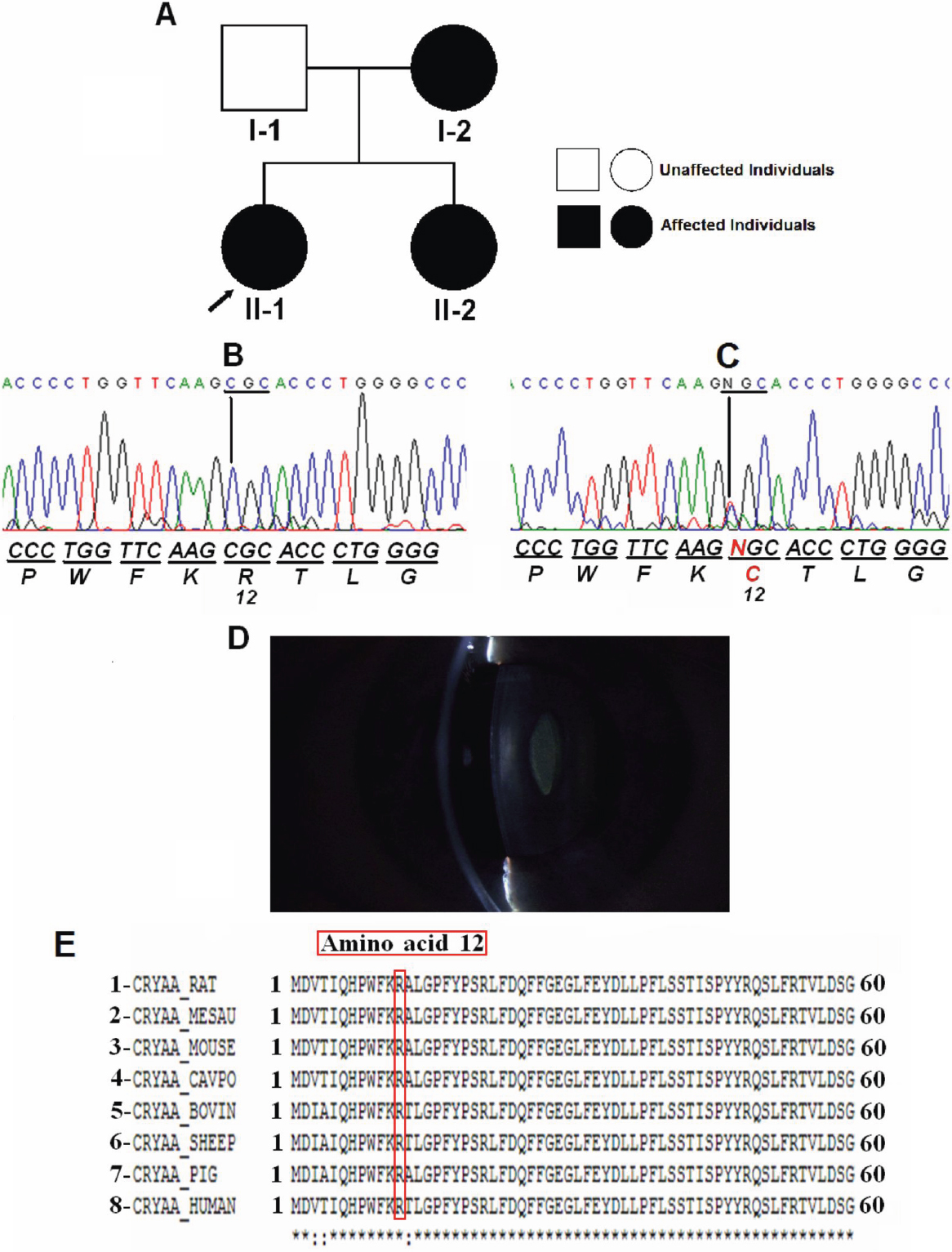 Figure 1. Mutation analysis of CRYAA in Family 4. A: