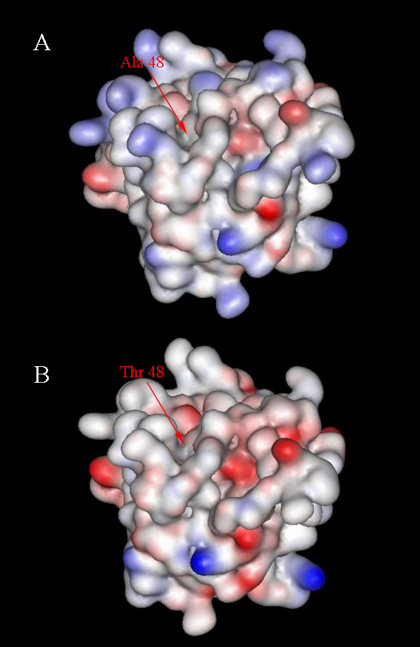 B) endostatins. Areas shown in red represent a negative potential while the blue areas are positive. The position 48 of the