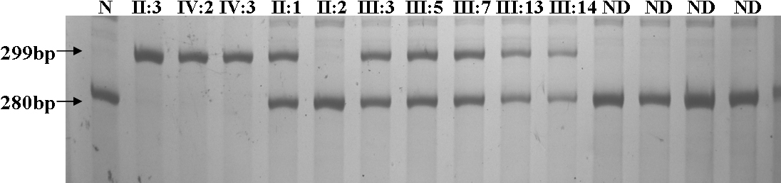 (II:1, III:3, III:5, III:7, III:13, and III:14) were determined to be mutation carriers. N: Normal individual; ND: Normal