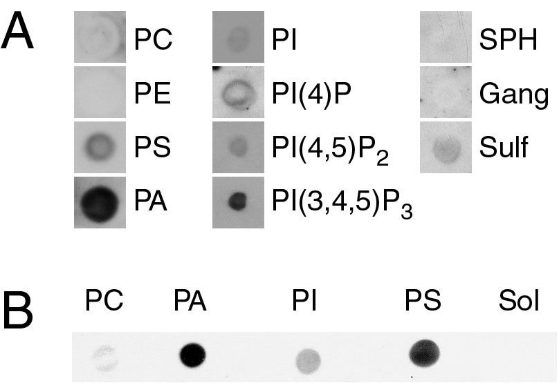 nitrocellulose. The results shown are representative of at least three independent analyses of each lipid. B: Active lipids were compared on the same blot. The lipids indicated below the blot were applied to nitrocellulose in small
