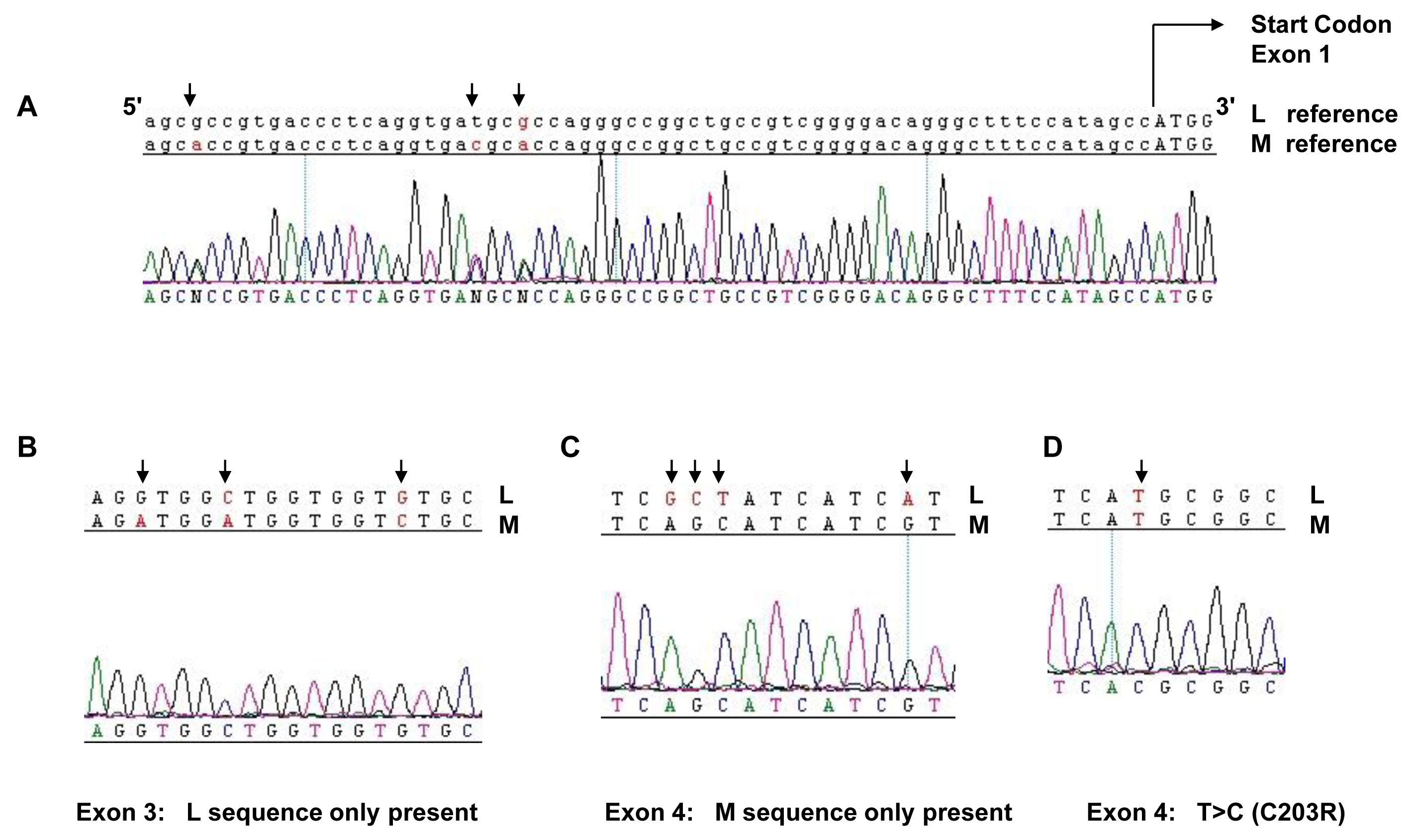 variation (arrows) between the L and M genes indicate only L opsin exon