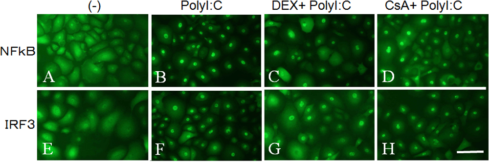 for 24 h. NFκB p65 staining without poly(I:C, A), with poly(I:C, B), with DEX 10-5M and poly(I:C, C), and with CsA 10-5M and poly(I:C, D). IRF3 staining without poly(I:C, E), with poly(I:C, F), with DEX 10-5M and poly(I:C, G), and with CsA 10-5M and poly(I:C, H). Scale bar, 100 µm. Activated NFκB p65 and IRF-3 were clearly detected in the nuclei of most of cultured HCECs 3 h after