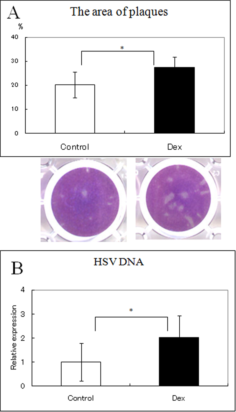 Figure 7. Effect of DEX and CsA on Herpes simplex virus 1 (HSV-1) infection. HCECs were cultured in the presence or absence of DEX (10-5 M), and inoculated with 50 MOI of HSV-1 for 48 h. The plaque area was increased when HCECs were pre-incubated with DEX (A). Real-time PCR results show a significantly higher level of HSV-1 DNA in the supernatant with DEX (B). (*p<0.05)