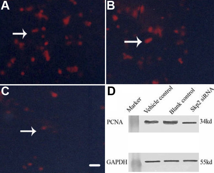 cells in vitro. Immunofluorescence staining indicated the expression of PCNA decreased in rLECs transfected with Skp2 siRNA (C) when compared with rLECs transfected with pSuppressor vehicle (A) or without transfection (B). The scale bar is 40 μm. Western blot showed that the expression of PCNA dramatically decreased after rLEC transfection