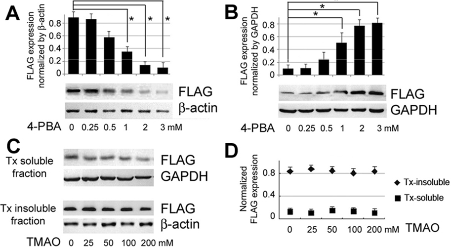 Asterisks indicate a p<0.05 by independent Student’s t-test. C: Treatment of cells with TMAO (0 to 300 mM) for two days followed by Tx solubility test for FLAG-tagged CRYGD expression.