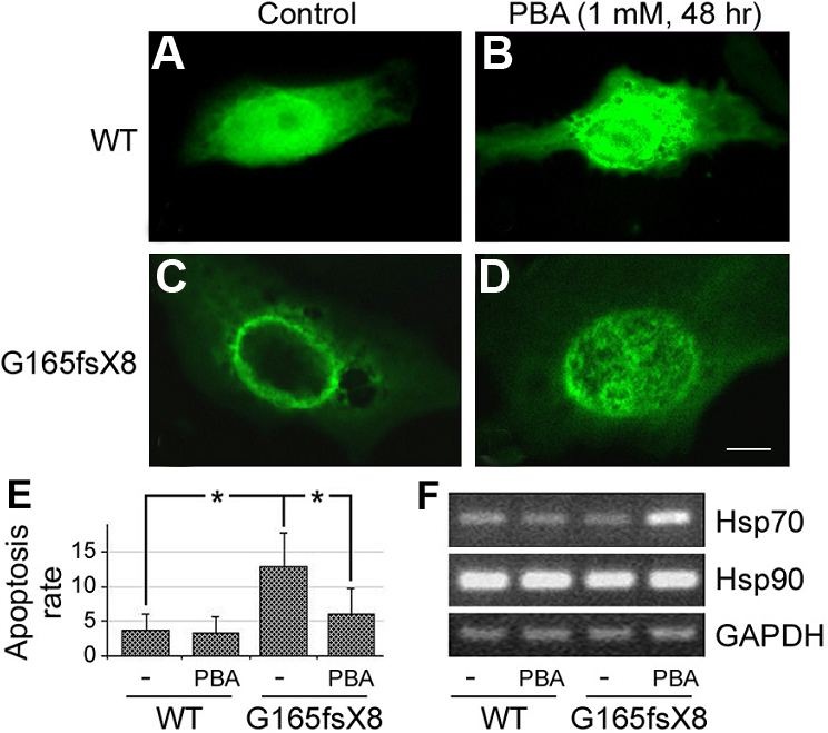 t-test. F: Semi-quantitative RT–PCR analysis showed specific upregulation of Hsp70 in G165fs CRYGD cells treated with 4-PBA (p<0.05,