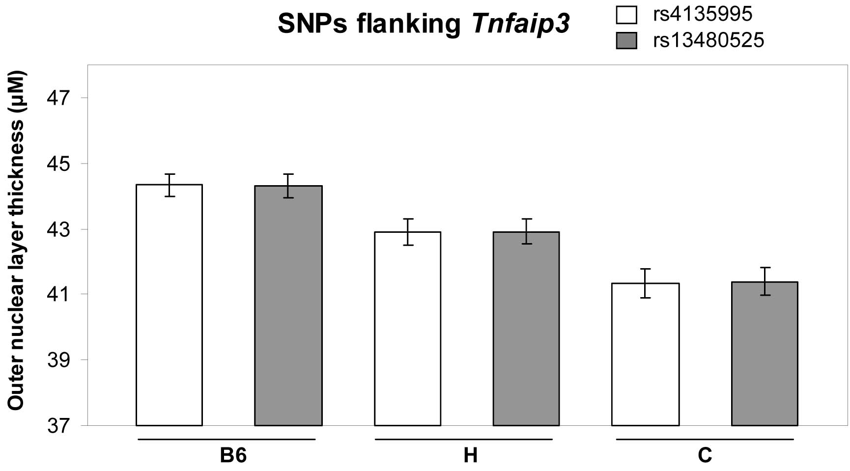 outer nuclear layer thickness of the B6, H (heterozygous), and C